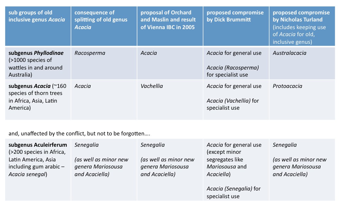 3) The compromise solution proposed by Turland looks to have disadvantages only. On the one hand, it is technically complicated (very untraditional and upsetting, perhaps even more of a break with how things have always been done than the proposal by Brummitt) and, on the other hand, it will mean that no species can have the name Acacia in the future. So, little or no benefit, at considerable cost.