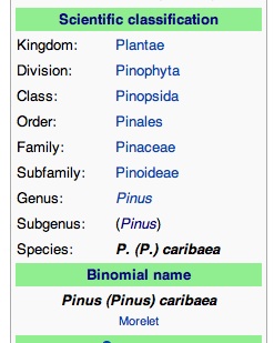 [This paragraph is an addition subsequent to the original posting]: I note that the proposal by Brummitt – continuing to use Acacia but for specialists inserting a parenthetical marker for the different new genera, as in Acacia (Vachellia) farnesiana – does not seem to be without precedent. In the table below – a screenshot from Wikipedia – the binomial name of the Caribbean pine (a favourite forestry tree here in Fiji), is listed as Pinus (Pinus) caribaea. It looks exactly as Brummitt’s solution would look. Seems to me like a non-offensive and sensible solution. Two disclaimers – one is that the middle Pinus refers to a sub-genus, not an actual genus (but see Jacques Vassal’s comments below); and another that this use does not appear to be common outside of the widely used Wikipedia.