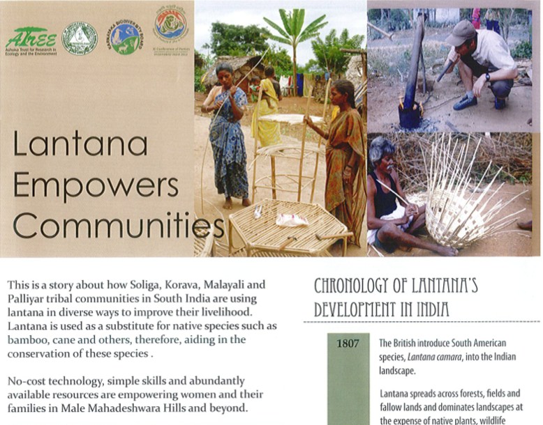 A third story is titled Lantana Empowers Communities, and this title comes directly from a brochure (see picture) produced by Ramesh Kannan, our former collaborator who sadly passed away abruptly late last year not long after our Kununurra field trip. His work (3) has shown that different ethnic communities have used lantana for livelihood activities like basketry for many decades. More recently, innovations in debarking the thorny stems have even made possible a niche furniture industry, substituting lantana for rattan.
