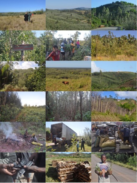 Figure 3 from our article: a photo collage. Row 1: landscapes near Vatomandry, including (left) grassland of type typically replaced by grevillea stands; (middle) dense even-age grevillea; (right) grevillea with Acacia mangium and eucalyptus. Row 2: Melaleuca landscapes: (left) private property sign; (middle) collectors selling harvest of leaves to essential oil buyers; (right) melaleuca in foreground with Ravinala madagascariensis and eucalyptus. Row 3: (left) agroforestry plots surrounded by grevillea; (middle) cow in former pasture landscape; (right) grevillea stand cleared to create litchi orchard near Vatomandry. Row 4: (left) mature and young stands of grevillea for fuel wood harvest; (middle) interior of tall grevillea stand; (right) grevillea fence poles. Row 5: The charcoal commodity chain: (left) charcoal over and women gleaning leftover coals; (middle) truck loading charcoal sacks; (right) roadside charcoal seller, Toamasina. Row 6: (left) comparing grevillea charcoal with large piece of eucalyptus charcoal; (middle) grevillea fire wood bundles for road side collection; (right) young man transporting grevillea seedlings. Photos by CAK except Row 3 right, by LGR.