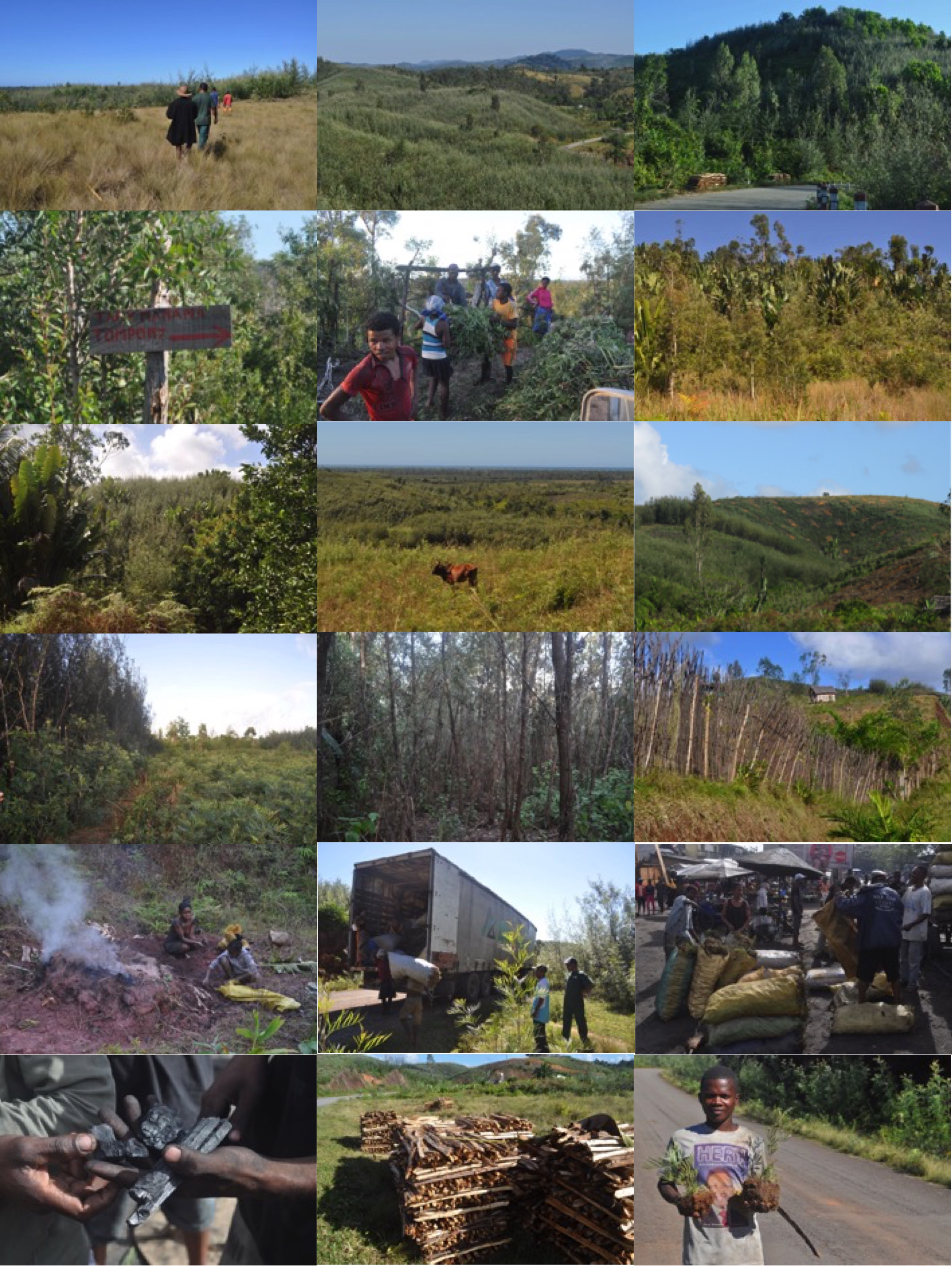Figure 3 from our article: a photo collage. Row 1: landscapes near Vatomandry, including (left) grassland of type typically replaced by grevillea stands; (middle) dense even-age grevillea; (right) grevillea with Acacia mangium and eucalyptus. Row 2: Melaleuca landscapes: (left) private property sign; (middle) collectors selling harvest of leaves to essential oil buyers; (right) melaleuca in foreground with Ravinala madagascariensis and eucalyptus. Row 3: (left) agroforestry plots surrounded by grevillea; (middle) cow in former pasture landscape; (right) grevillea stand cleared to create litchi orchard near Vatomandry. Row 4: (left) mature and young stands of grevillea for fuel wood harvest; (middle) interior of tall grevillea stand; (right) grevillea fence poles. Row 5: The charcoal commodity chain: (left) charcoal over and women gleaning leftover coals; (middle) truck loading charcoal sacks; (right) roadside charcoal seller, Toamasina. Row 6: (left) comparing grevillea charcoal with large piece of eucalyptus charcoal; (middle) grevillea fire wood bundles for road side collection; (right) young man transporting grevillea seedlings. Photos by CAK except Row 3 right, by LGR.
