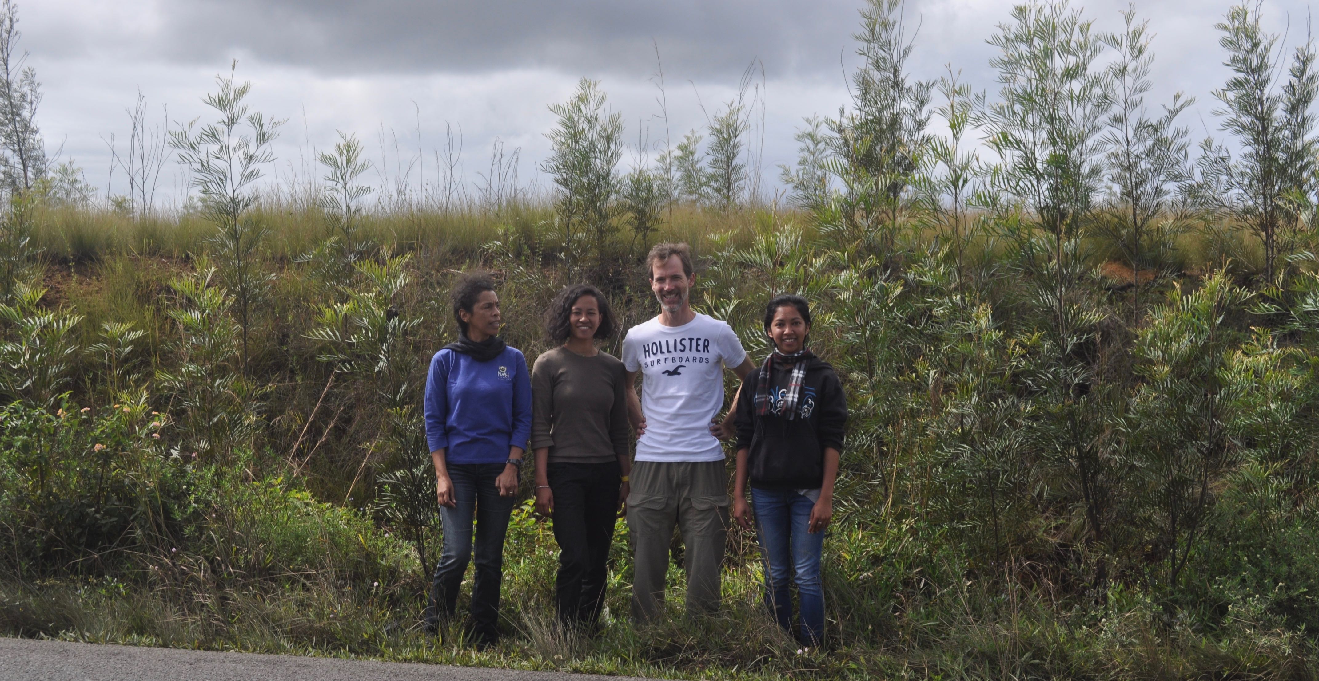 The study authors (and a few scrubby roadside grevillea) after field visits in 2016. Lalanirina Gabrielle Rajoelison (left) is Professor at ESSA-Forêts, University of Antananarivo, and studied techniques for aerial seeding of grevilla in the mid-1980s (never implemented). Aina Radaniela Andrianoro (2nd from left) and Somboniaina Larissa Harimanana (right) received their Masters degrees at the end of 2016, after defending their theses on, respectively, the ecological and socio-economic aspects of grevillea forests.