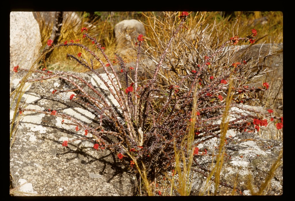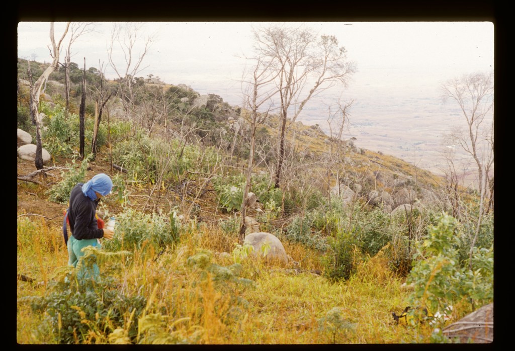 Climbing Ambohiby – on Sunday July 11, 1999 – was a weekend recreational excursion after a week of my doctoral field research on fire practices in a village near Tsiroanomandidy (one that Jean-Pierre Raison had researched and mapped in the late 1960s and I had studied in 1994). I went with forestry student Gidehona Randriamboavonjy and several volunteers from the French agricultural development aid organization AFDI we had met in Tsi’didy. We climbed directly, steeply up a trail that served as a chute for dragging trees cut out of the mountain forest, then higher up climbed straight up a stream bed, over cascades, and on through brush, grass, and forest islands – real technical bushwacking – to the summit of the mountain, where there was a large ancient tomb. Hundreds of pesky black flies or midges (mokafohy) bothered us the whole way. The views from the top were of beautiful pastures in all directions. And closer, there were multiple forest fingers, in various stream hollows, ravines, in patches on the summit, and especially in the south-facing bowl west of the main summit. This big forest had both deciduous and evergreen trees. Above 1500m the plants were covered in lichen, mosses, including the spiny rock-growing plants. All of the forests showed heavy signs of usage, tree cutting, and attacks by fire – quite heavily degraded. Nonetheless, we saw from far some white and black big lemurs (tsibahaka; Propithecus verrauxi deckeni) in the trees. There were cattle tracks and droppings all over.