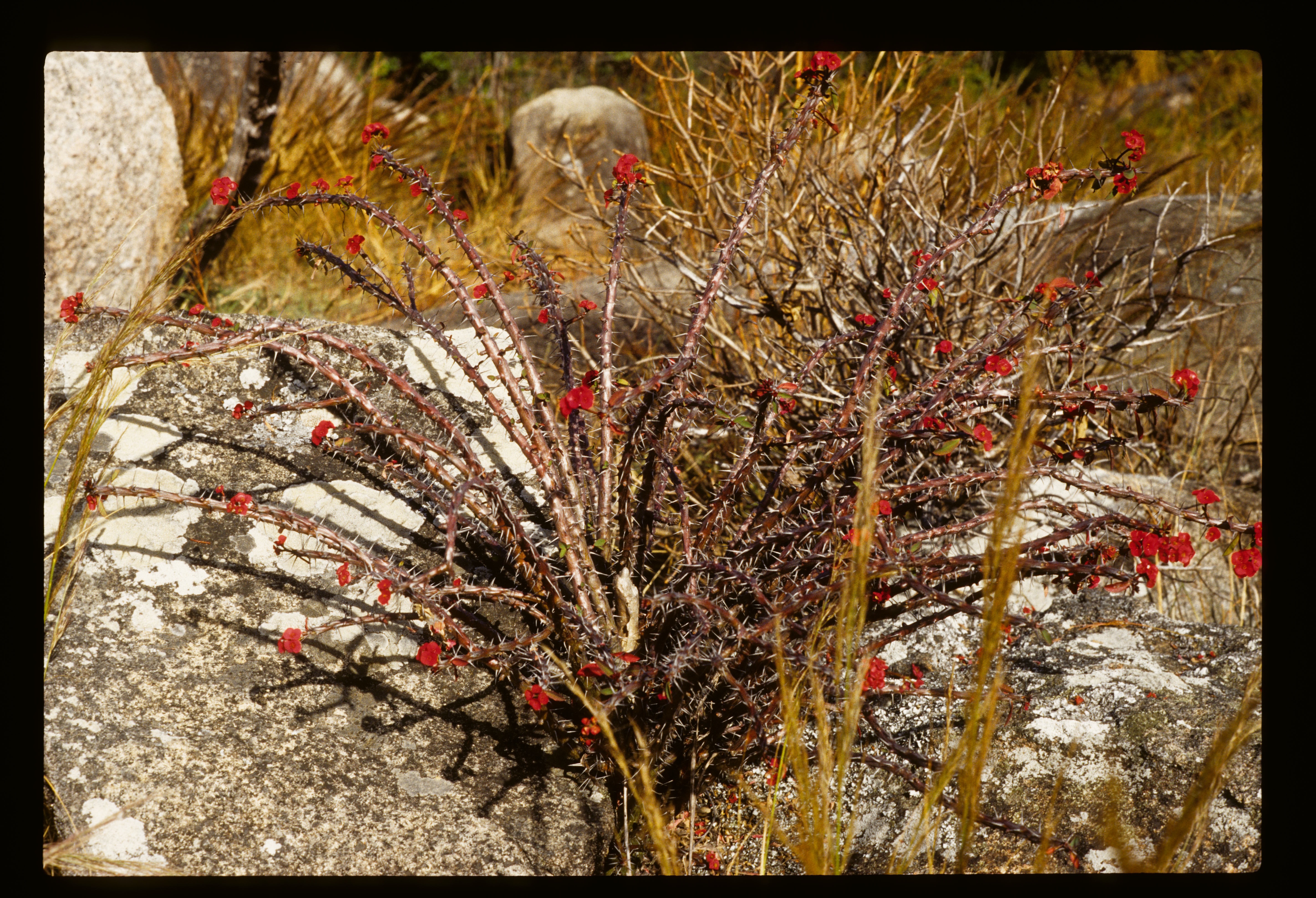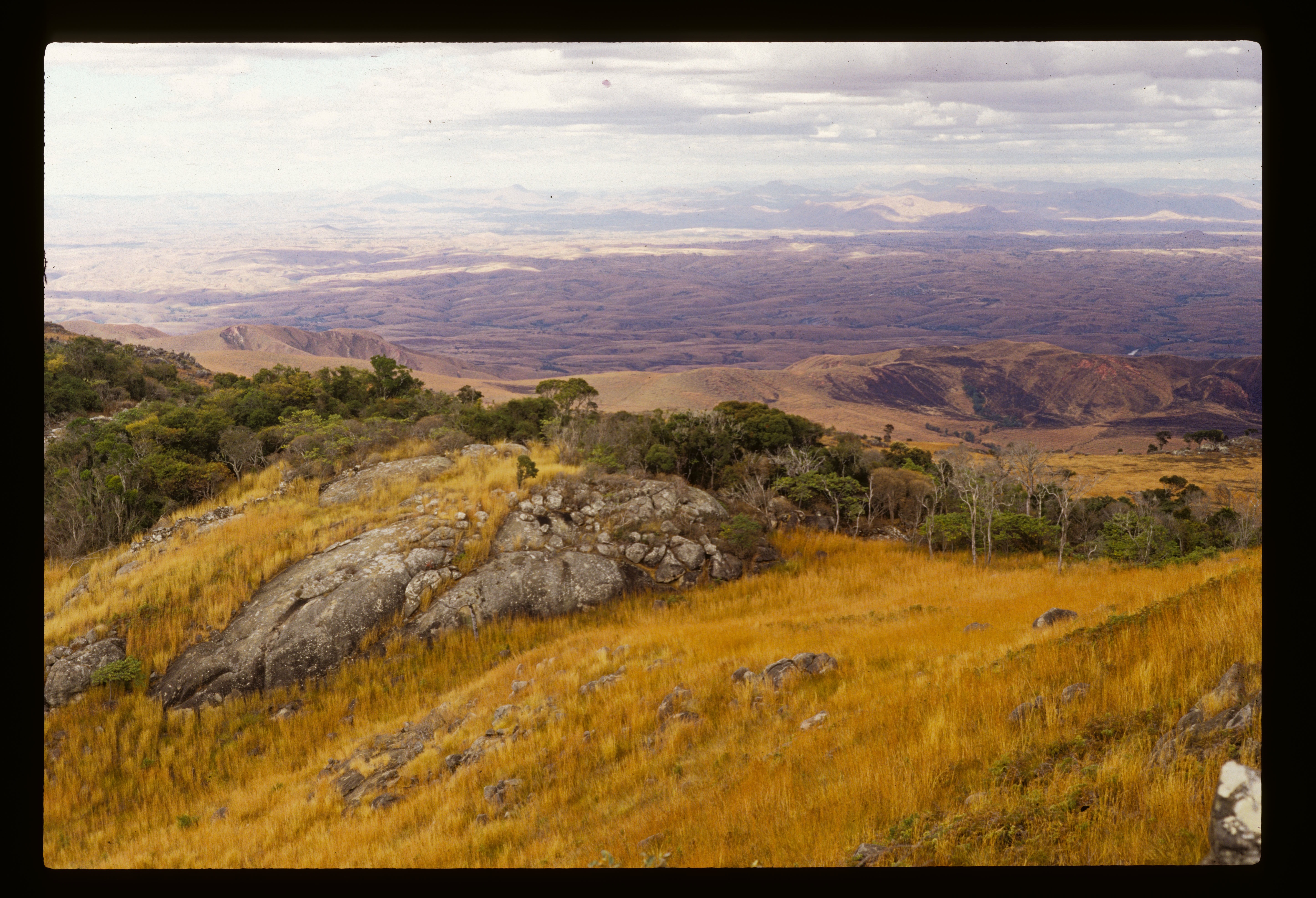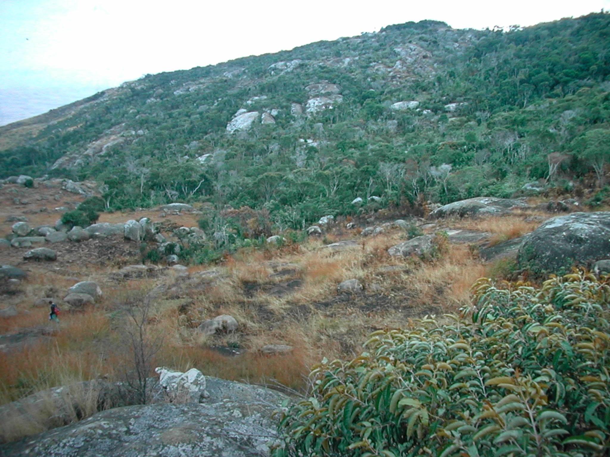 Climbing Ambohiby – on Sunday July 11, 1999 – was a weekend recreational excursion after a week of my doctoral field research on fire practices in a village near Tsiroanomandidy (one that Jean-Pierre Raison had researched and mapped in the late 1960s and I had studied in 1994). I went with forestry student Gidehona Randriamboavonjy and several volunteers from the French agricultural development aid organization AFDI we had met in Tsi’didy. We climbed directly, steeply up a trail that served as a chute for dragging trees cut out of the mountain forest, then higher up climbed straight up a stream bed, over cascades, and on through brush, grass, and forest islands – real technical bushwacking – to the summit of the mountain, where there was a large ancient tomb. Hundreds of pesky black flies or midges (mokafohy) bothered us the whole way. The views from the top were of beautiful pastures in all directions. And closer, there were multiple forest fingers, in various stream hollows, ravines, in patches on the summit, and especially in the south-facing bowl west of the main summit. This big forest had both deciduous and evergreen trees. Above 1500m the plants were covered in lichen, mosses, including the spiny rock-growing plants. All of the forests showed heavy signs of usage, tree cutting, and attacks by fire – quite heavily degraded. Nonetheless, we saw from far some white and black big lemurs (tsibahaka; Propithecus verrauxi deckeni) in the trees. There were cattle tracks and droppings all over.