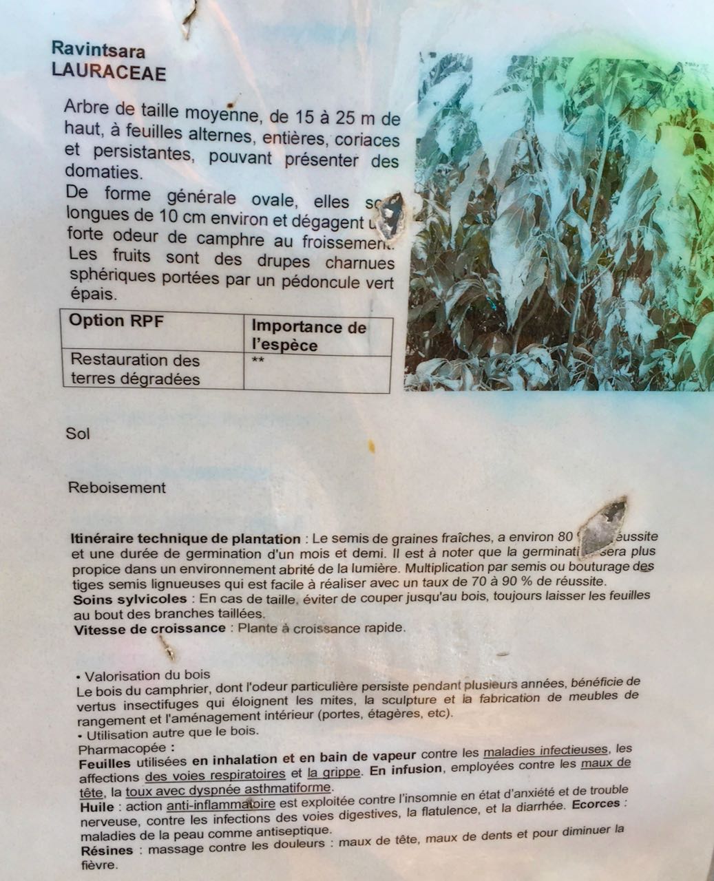 Ravintsara technical information posted in a remote project nursery 50km north of Fort Dauphin, Madagascar (CK, 2022)