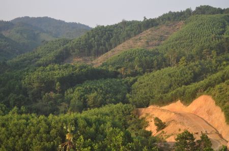 Expanding acacia plantations and (in the far back) natural forest in Huong Nguyen commune, Thừa Thiên-Huế province